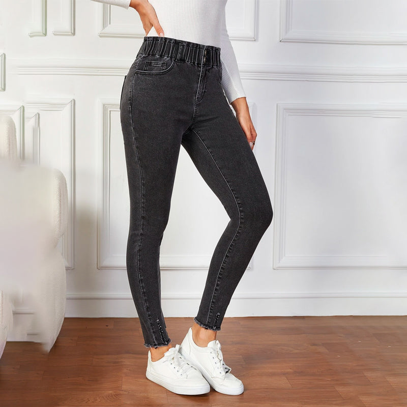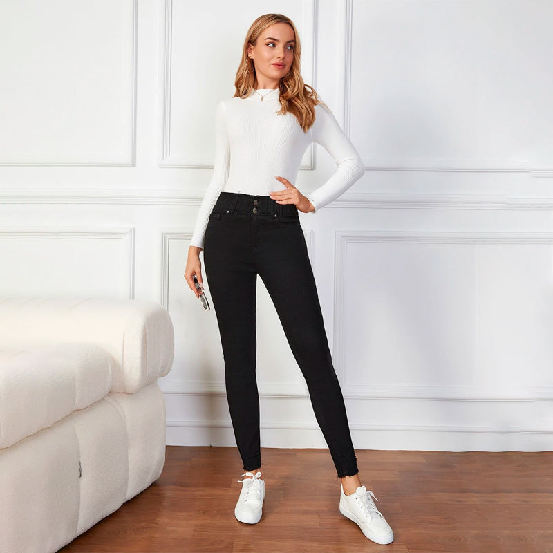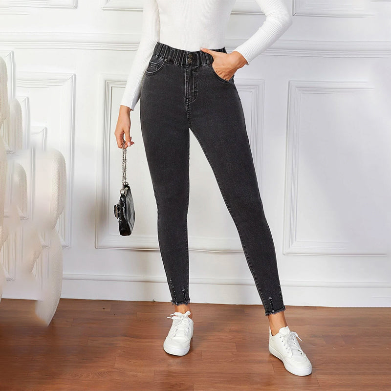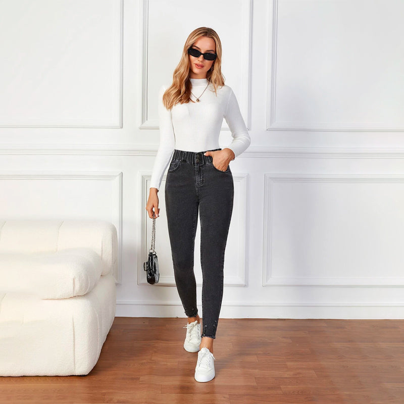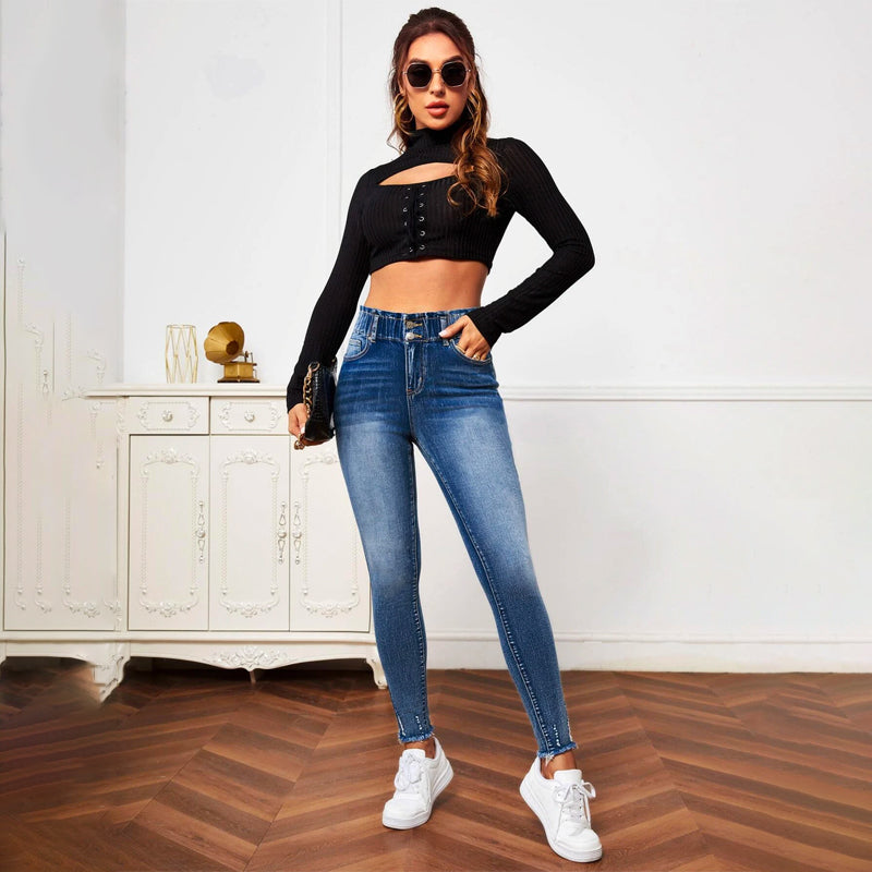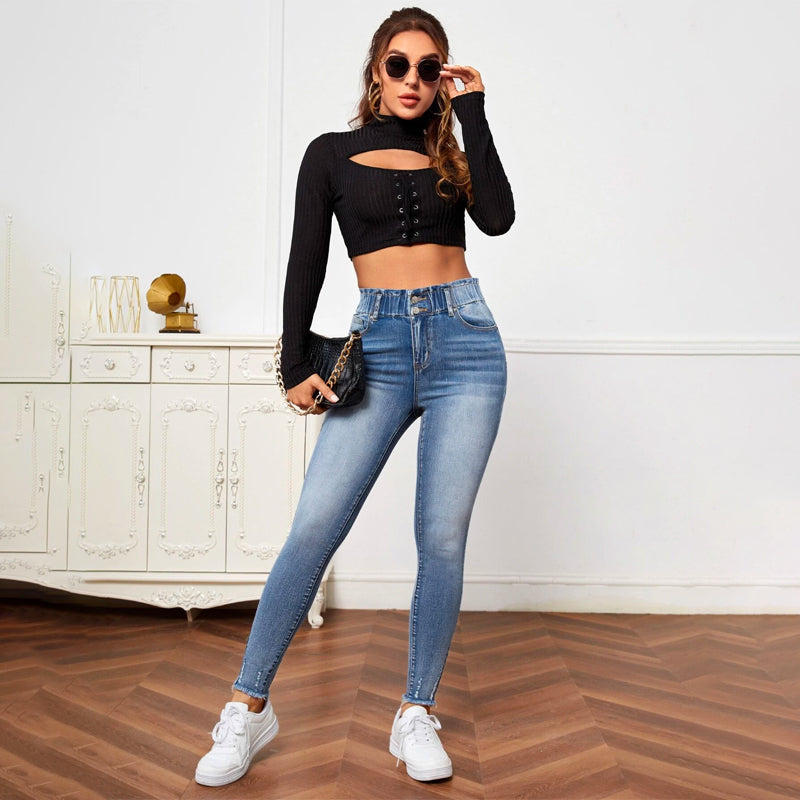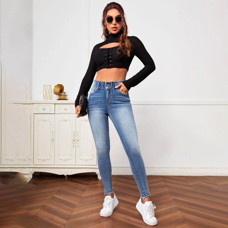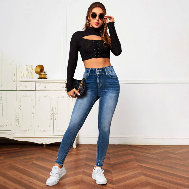 Ripped Frayed Hem Bleach Wash Paperbag Waist Skinny Jeans have a plain pattern and offer a skinny fit. It has a fine texture because it is made with a composition of cotton, polyester, and elastane. The high waistline and long length make everything you wear to look classy.