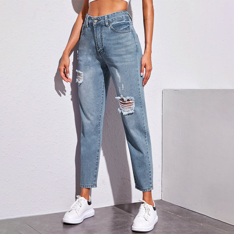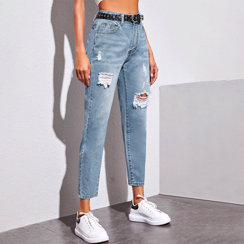 Ripped Washed Crop Jeans have a cropped length and offer a mom fit. These jeans can be paired with anything of your choice. It is made with a composition of cotton, polyester, and viscose which gives it a very fine texture. You can easily wash it in the machine while maintaining the quality.