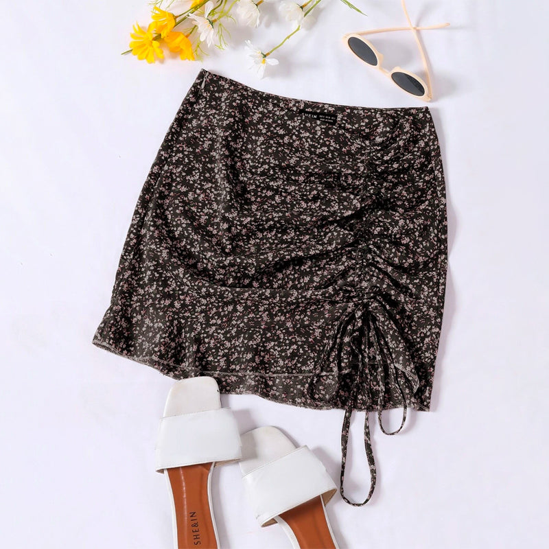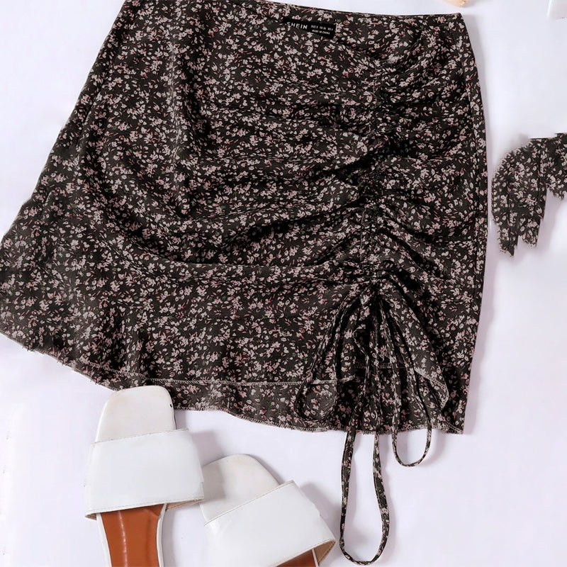 Ruched Knot Ruffle Hem Ditsy Floral Skirt
