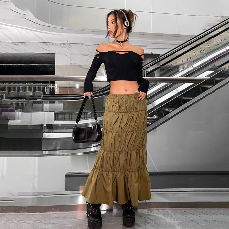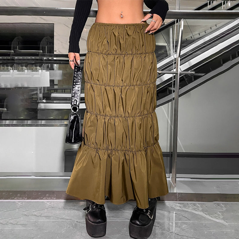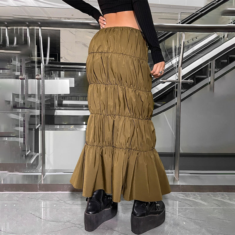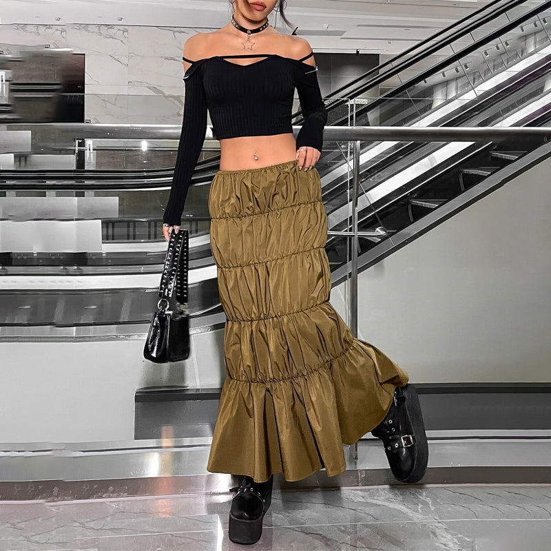 The Ruffle Hem Ruched Detail Skirt is a long ruffle skirt featuring a button closure and medium pockets. Soft and stretchy fabric, easy breezy dress that you can wear with black sandals or wedges to feel comfortable, and chic! The drop waist and mermaid type make the skirt stand out.