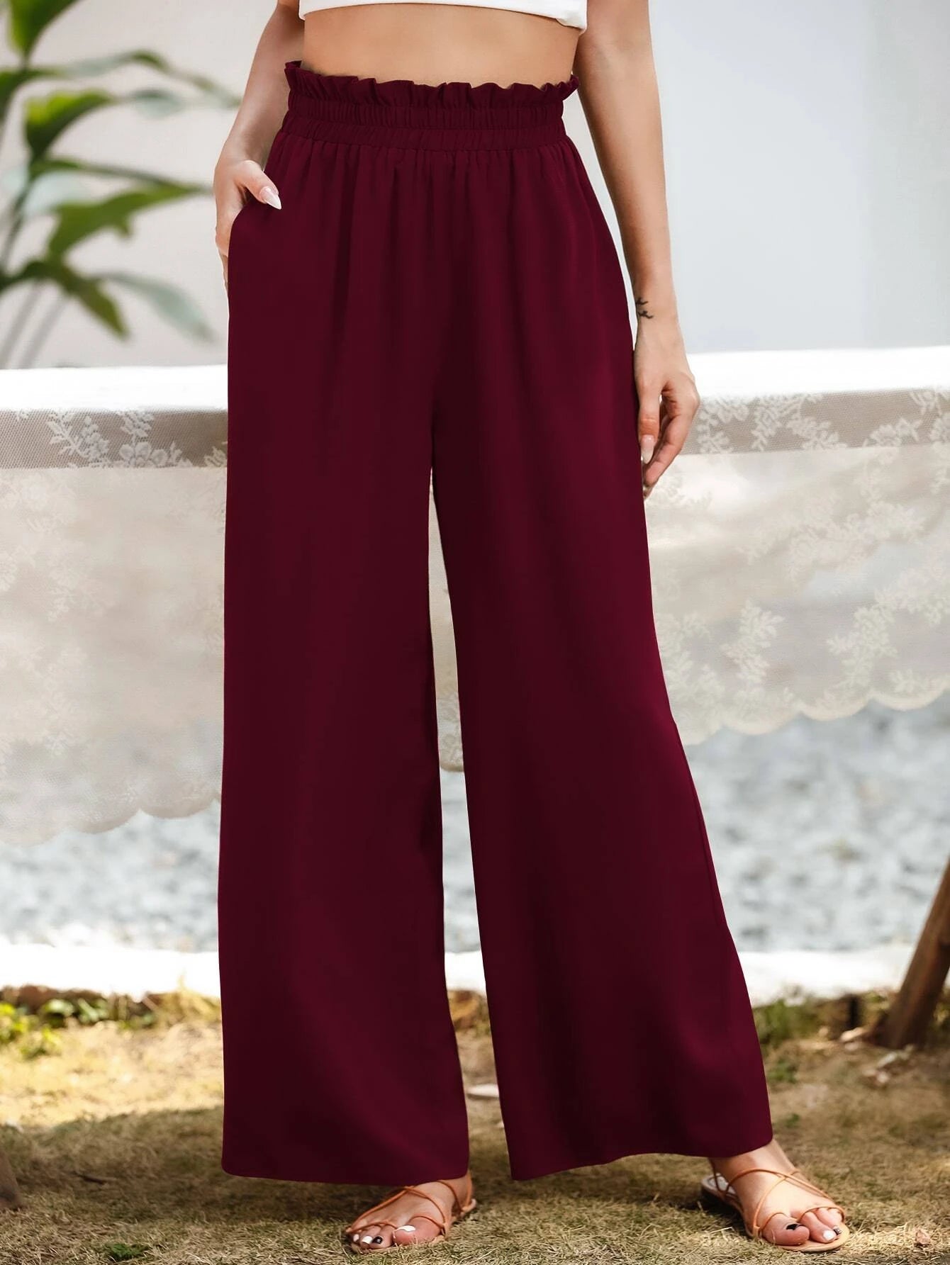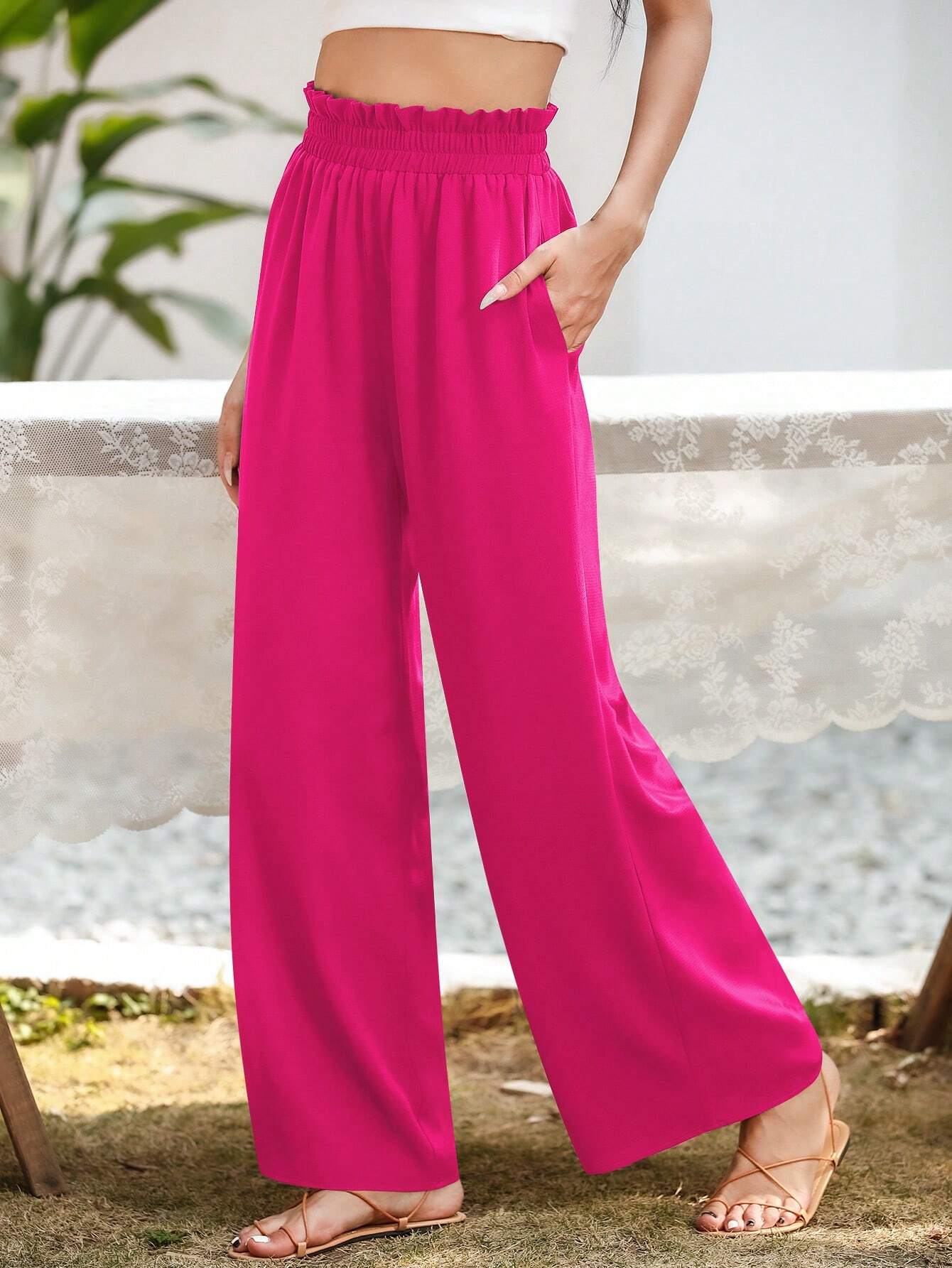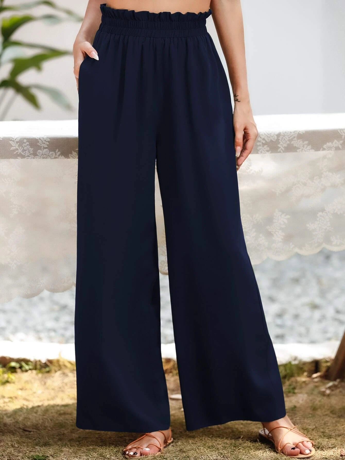 Upgrade your casual wardrobe with these stylish Slant Pocket Wide Pants. Crafted from polyester, these pants offer a luxurious and lightweight feel that's perfect for all-day wear. The plain pattern exudes simplicity and sophistication, making them versatile enough for various occasions. The paper bag waist detail adds a touch of fashion-forward flair, elevating the overall look.