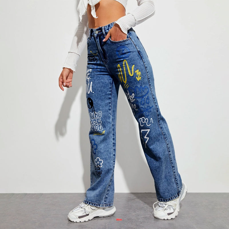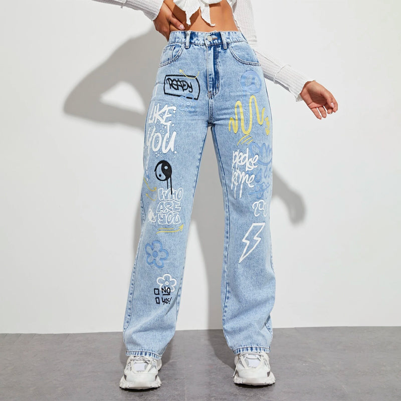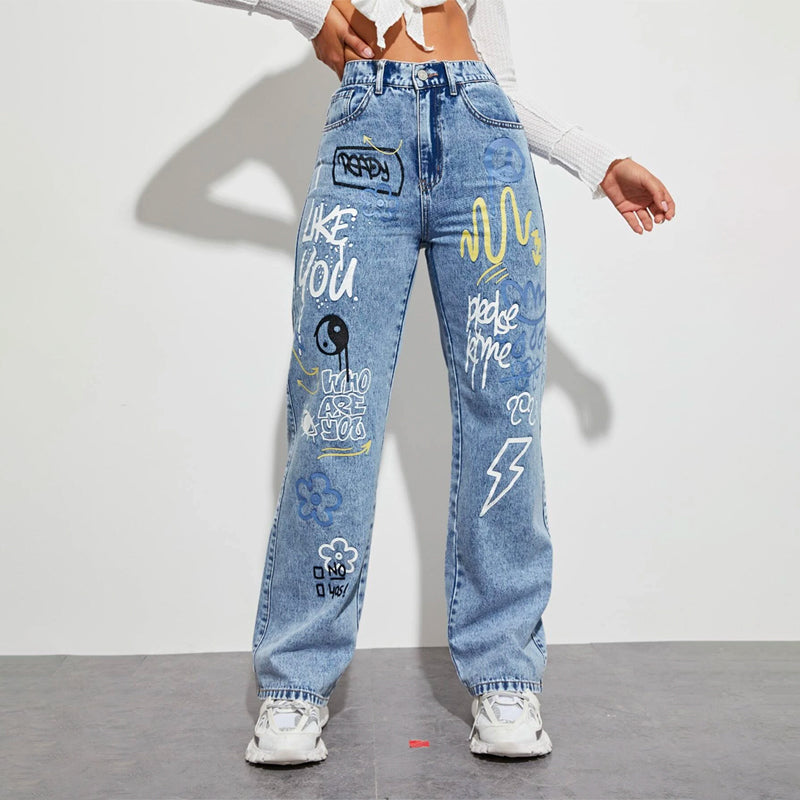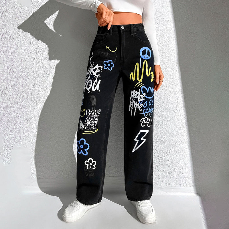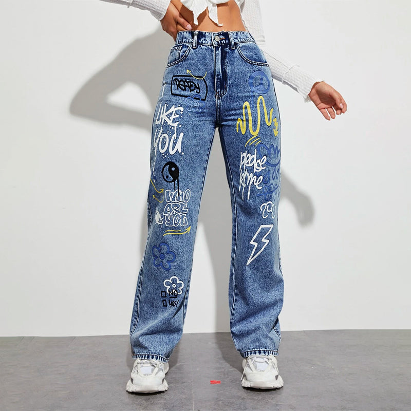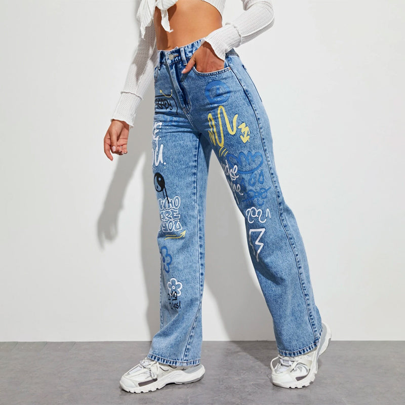Slogan and Yin & Yang Print Jeans have a floral and slogan pattern making t very unique and different in style. These jeans have a unique print and a natural waistline. The long length and regular fit make it versatile for any occasion or outing. You can pair it up with any kind of top of your choice.