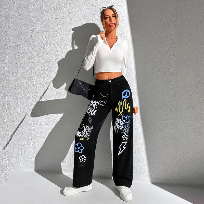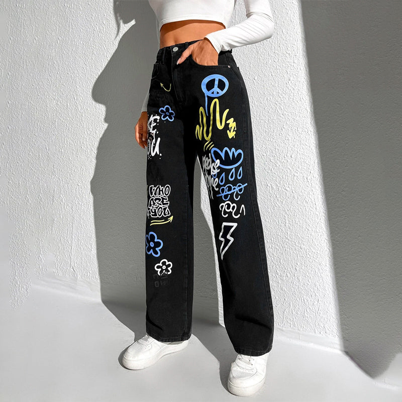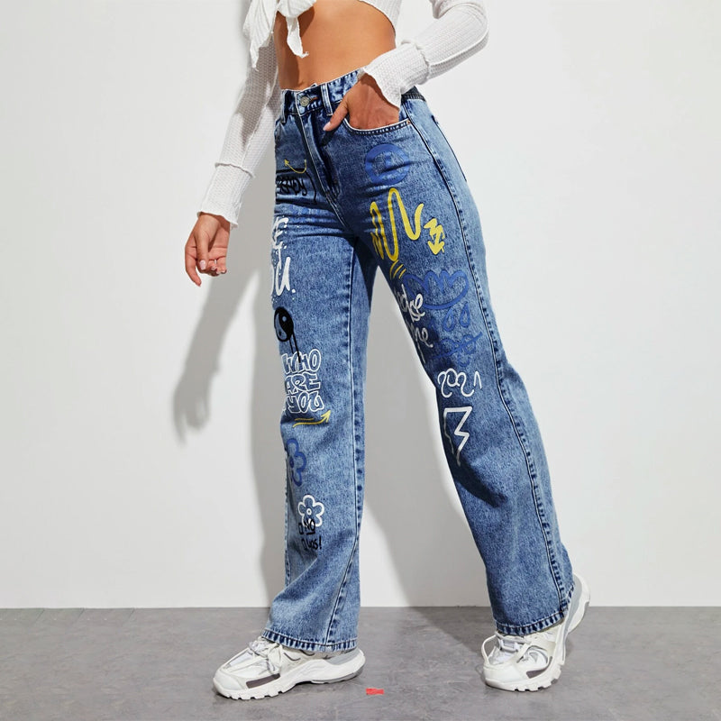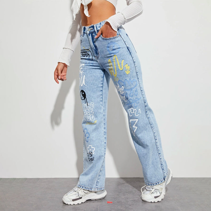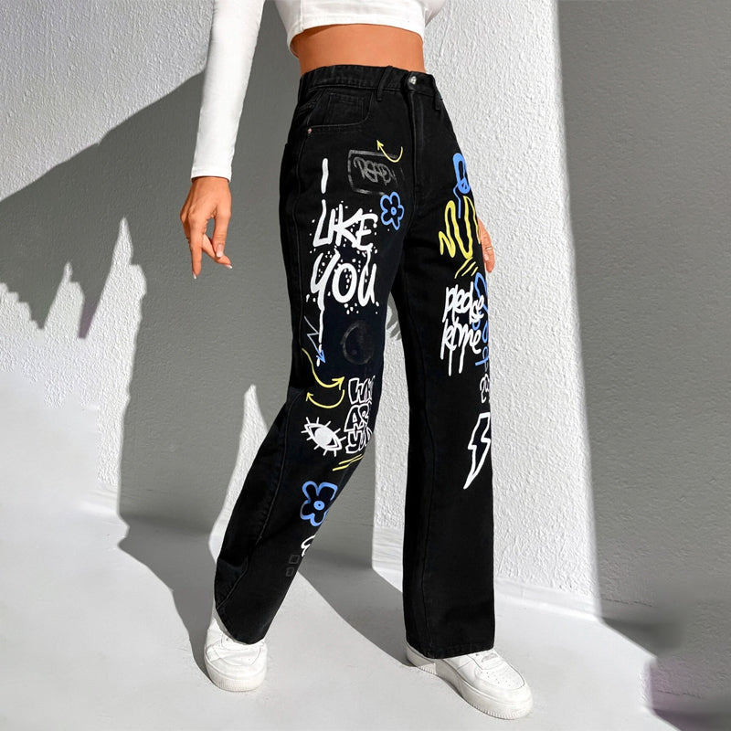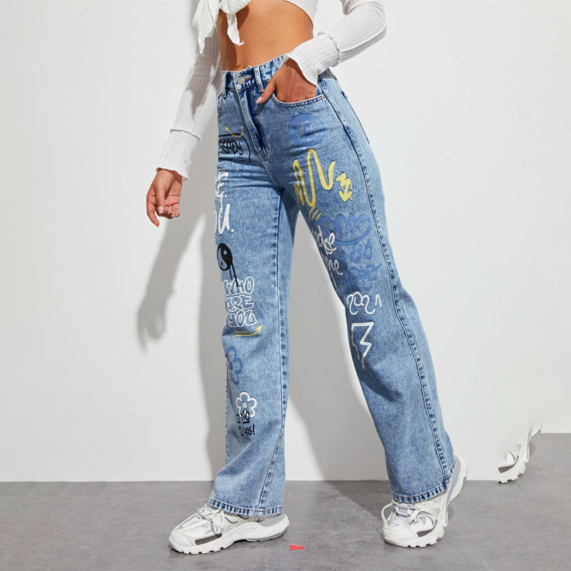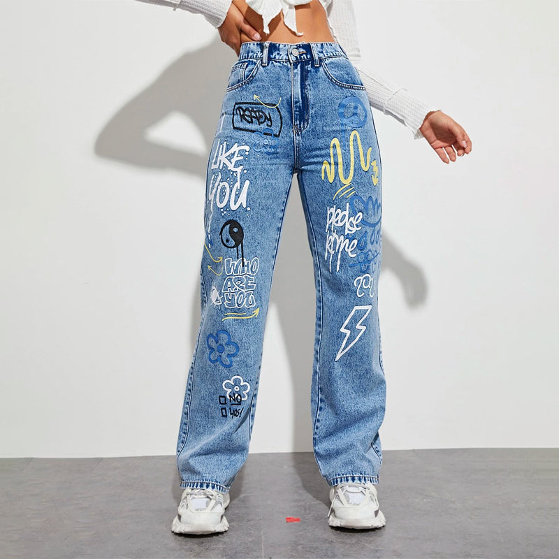 Slogan and Yin & Yang Print Jeans have a floral and slogan pattern making t very unique and different in style. These jeans have a unique print and a natural waistline. The long length and regular fit make it versatile for any occasion or outing. You can pair it up with any kind of top of your choice.