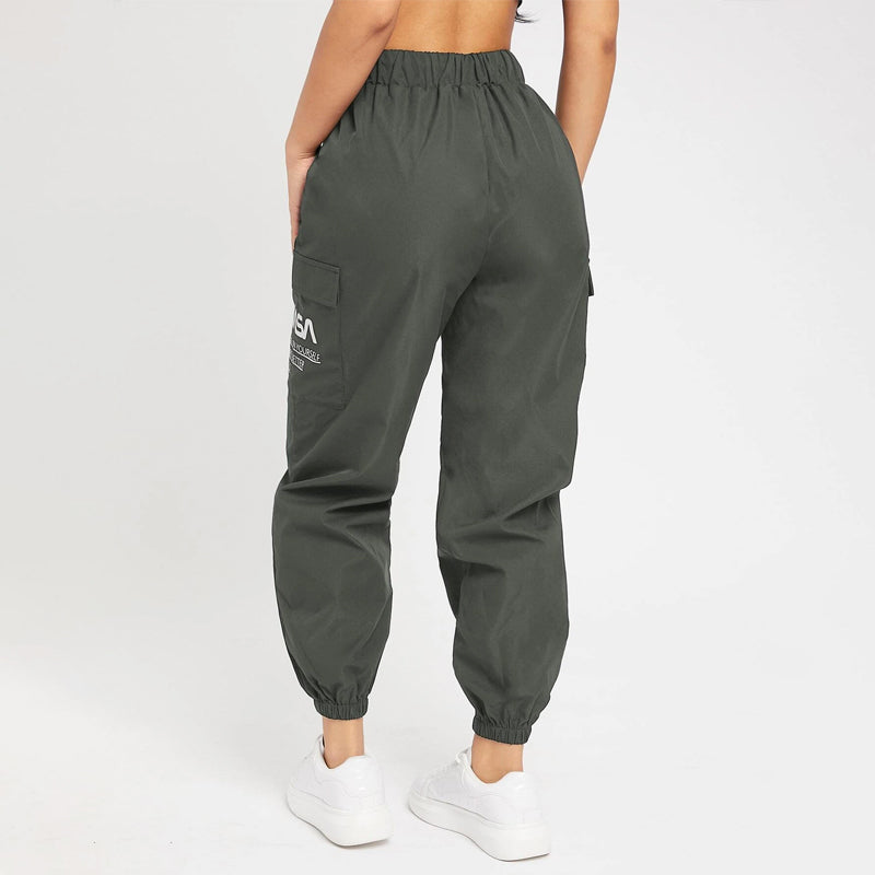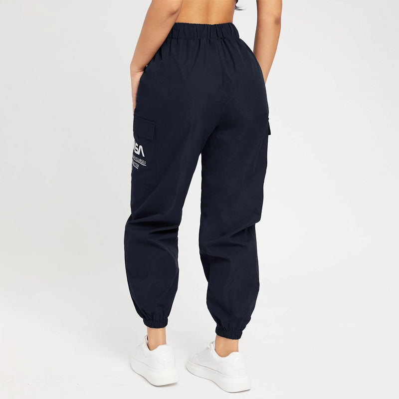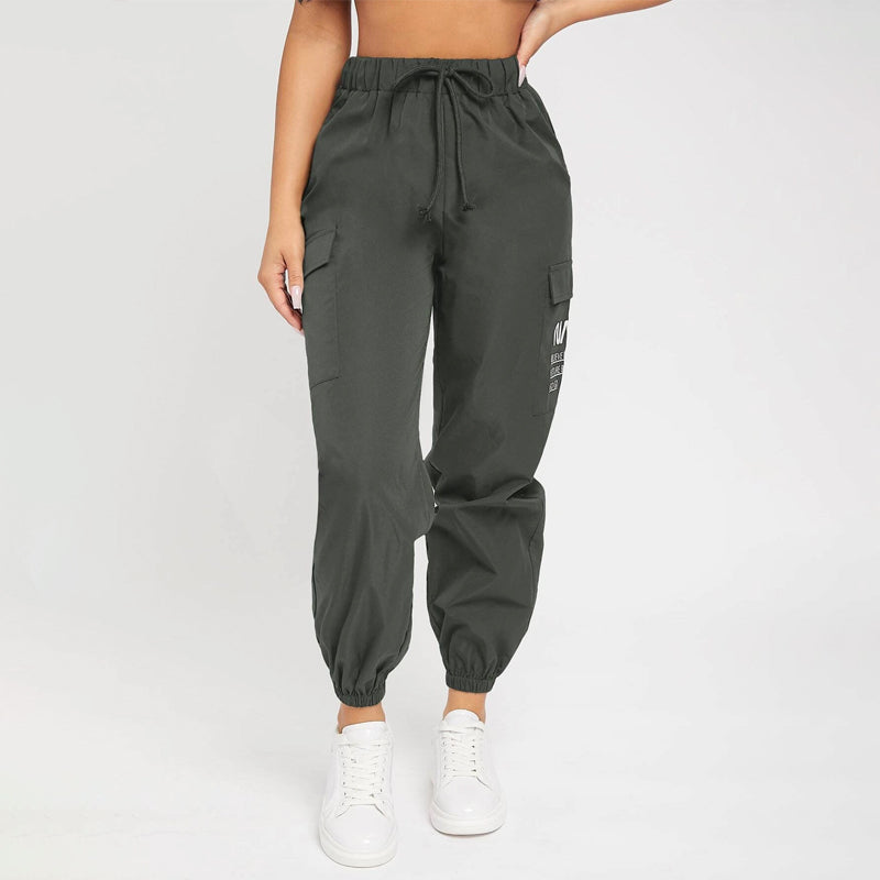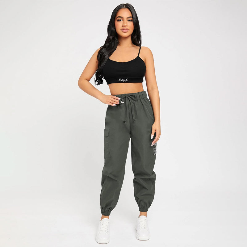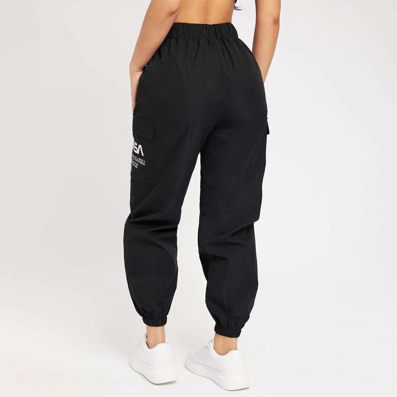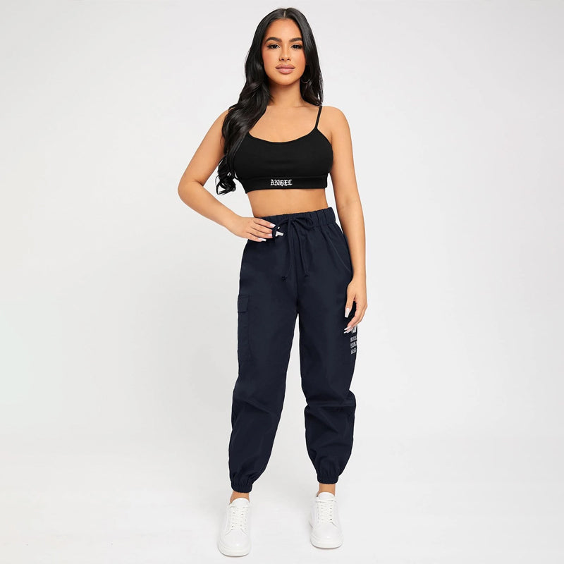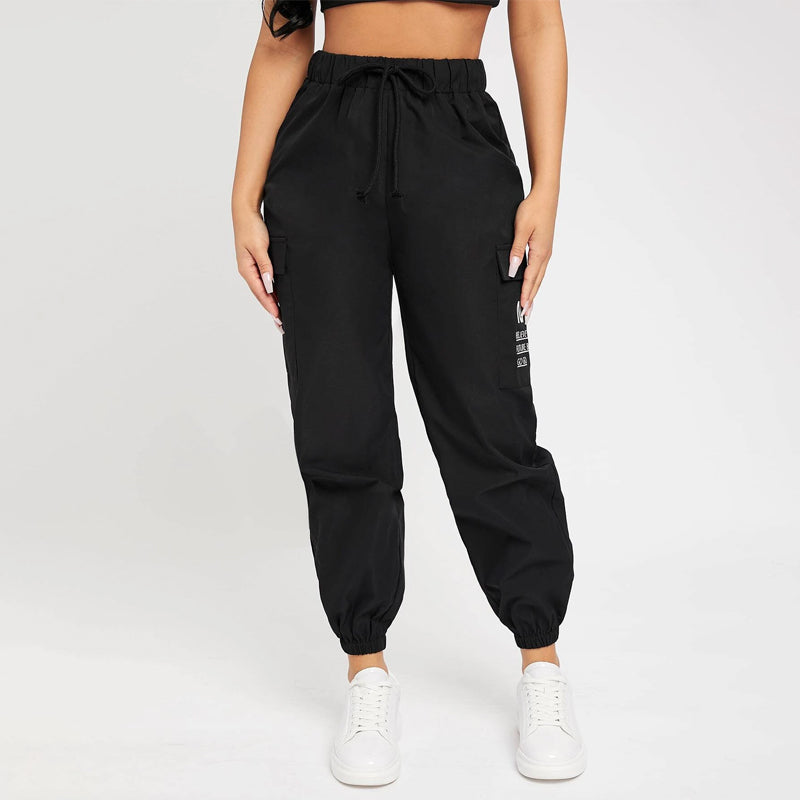 Slogan Patched Drawstring Pants are a great choice for everyday wear with a comfortable elastic waistband. These pants feature a pair of pockets along the side and a high waist silhouette. This versatile piece can go from day to evening in style. The drawstrings make these pants comfortable and adjustable.