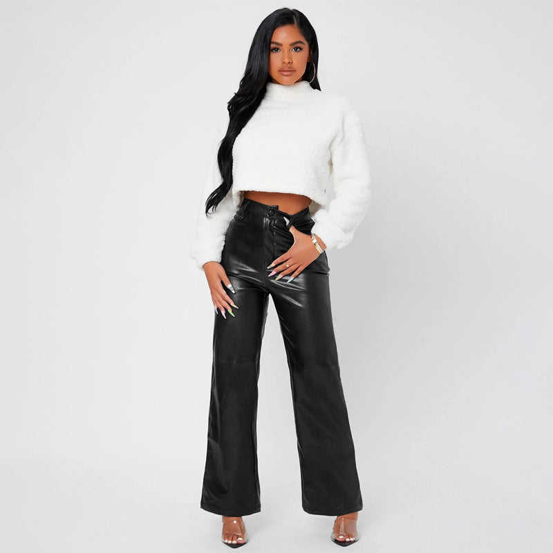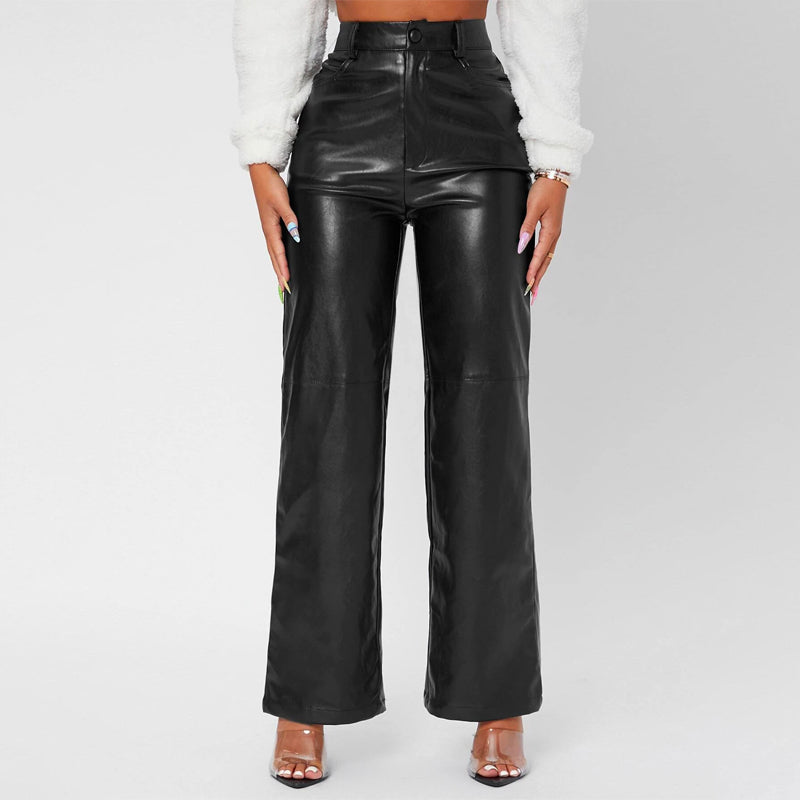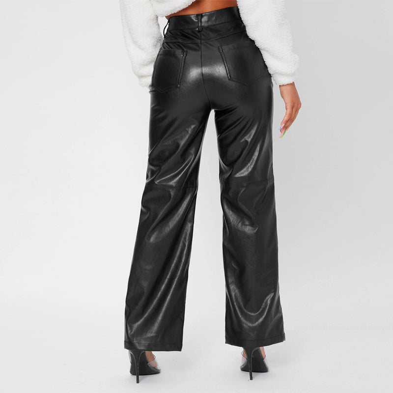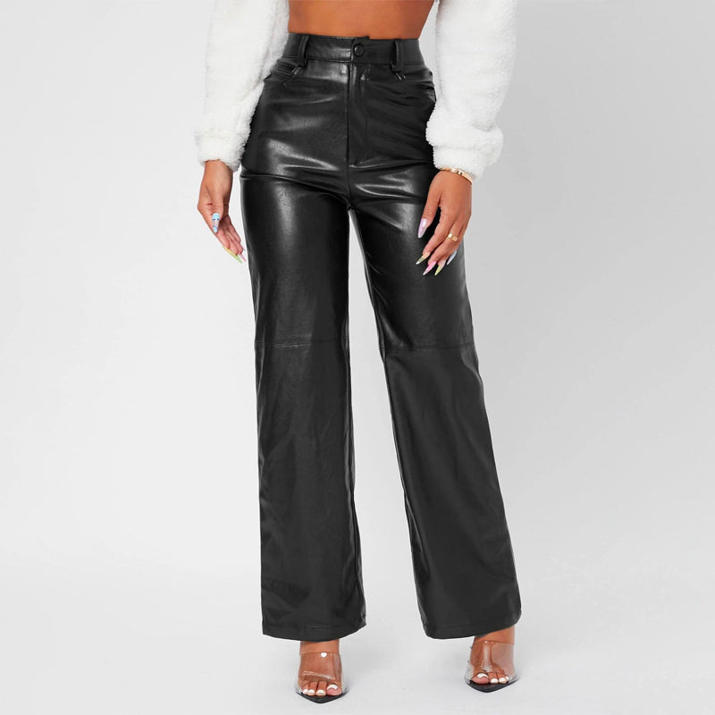 Solid High Waist Straight Leg Leather Pants