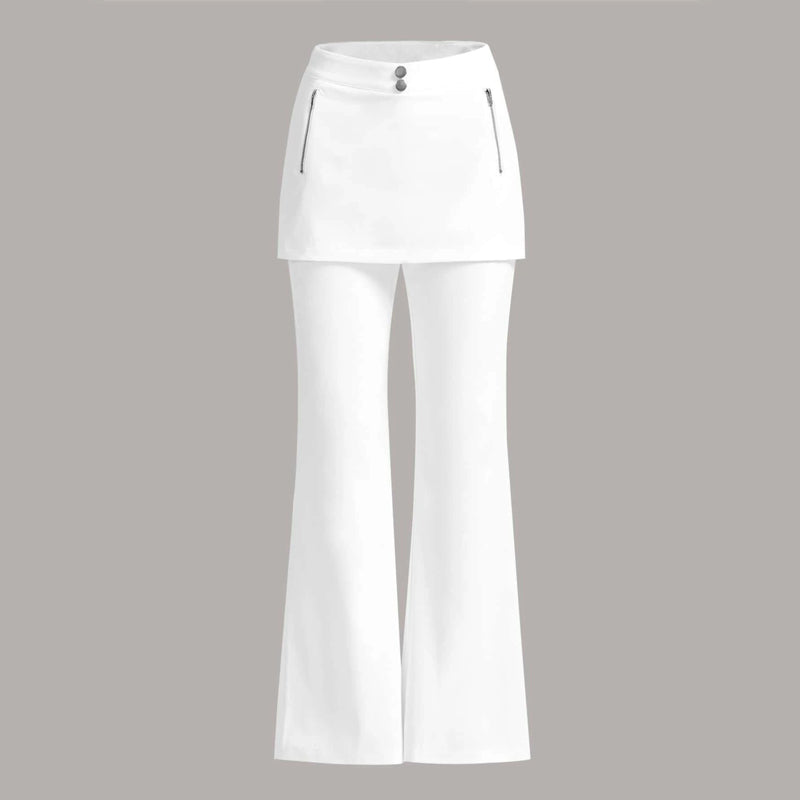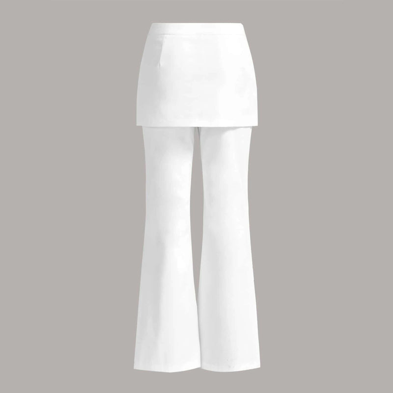 Solid Zipper Detail Skirt Overlay Pants are lightweight, the casual pant is perfect for any time of year. Featuring a drop waist and plain pattern. The zipper closure and pockets make them functional along with being extremely stylish. The flare leg and regular fit add a unique edge.