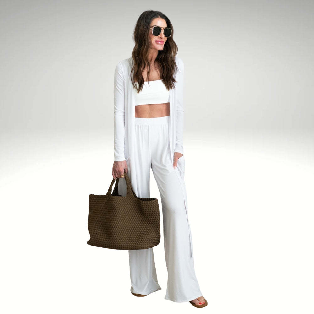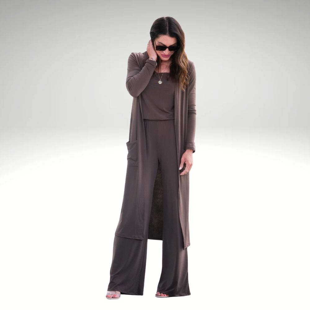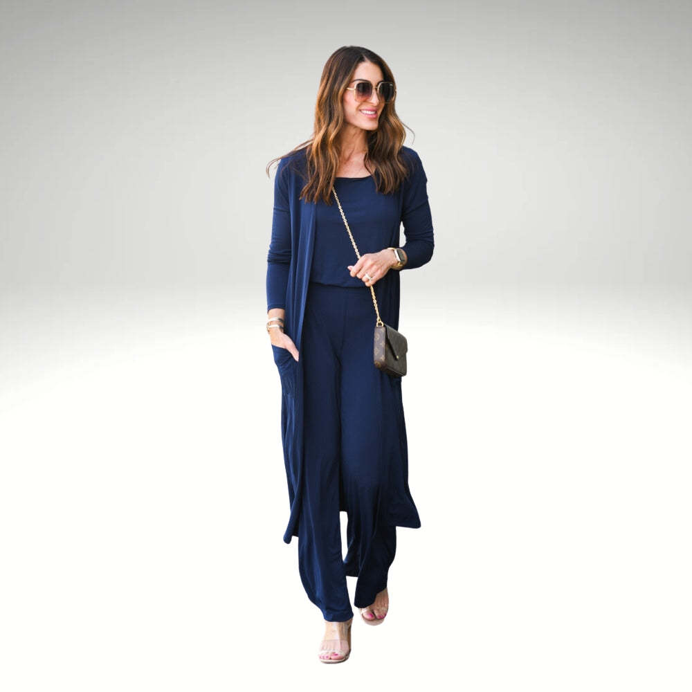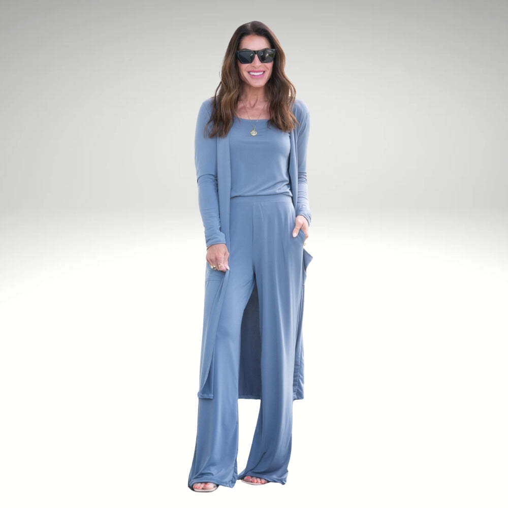 Versatile Three-Piece Design: Includes a tank top, wide-leg pants with an elastic waistband, and a long open-front cardigan to provide a complete and cohesive look.