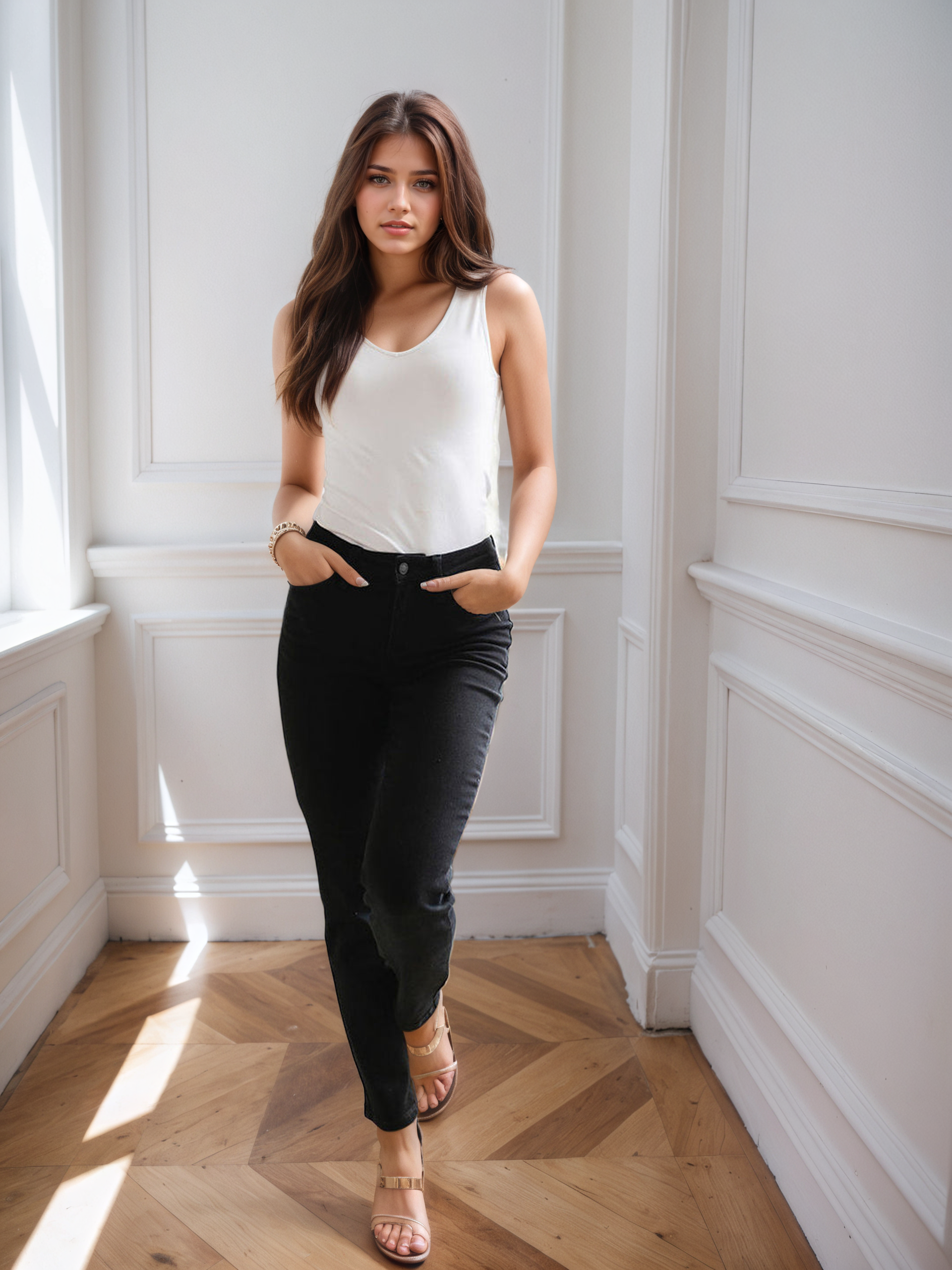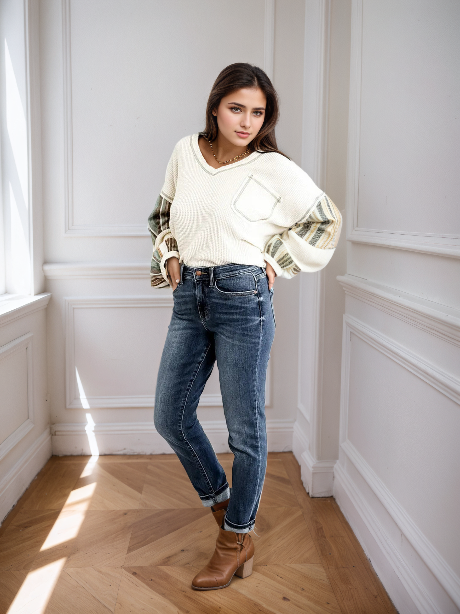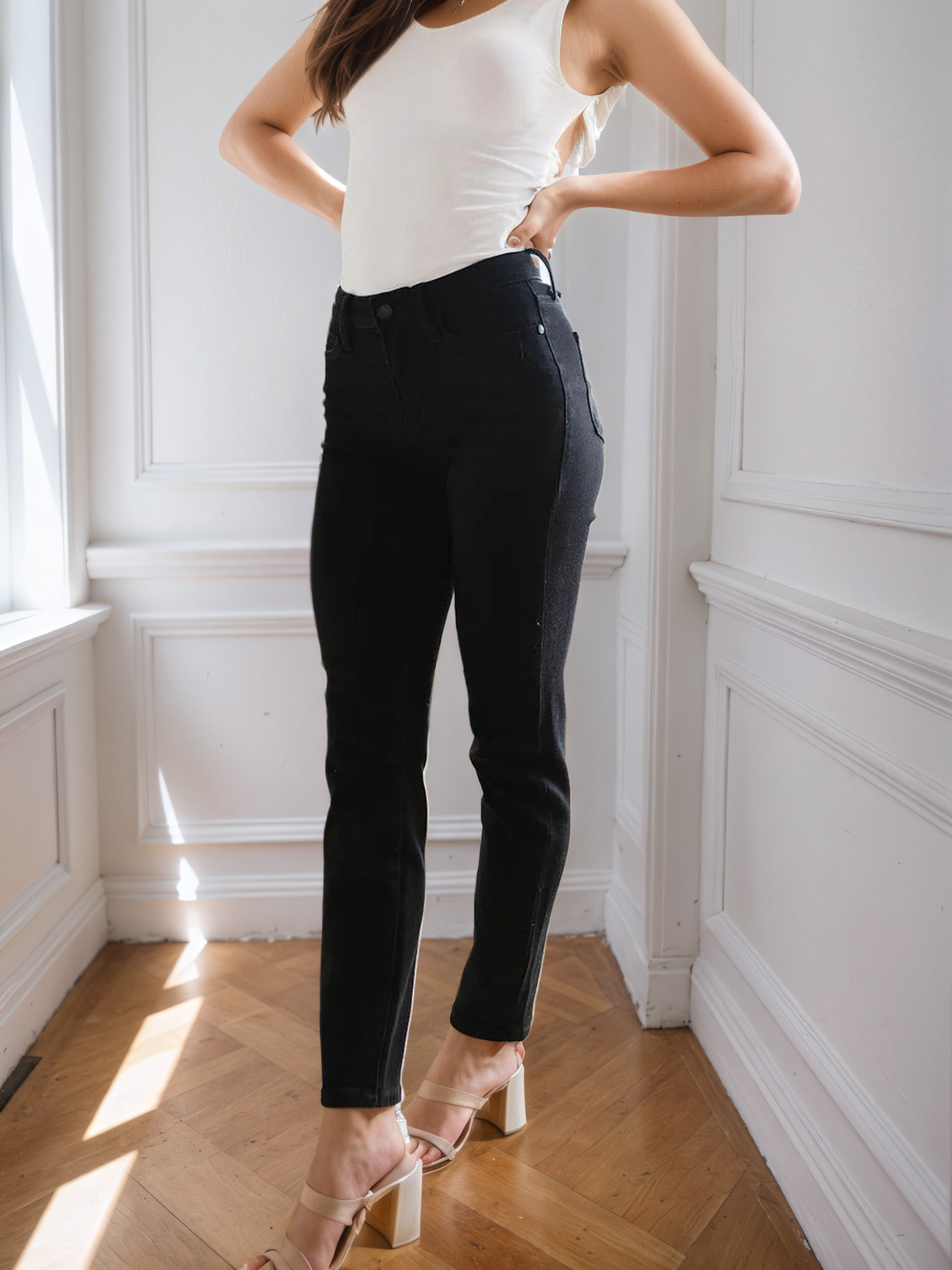 Next is the fit for these jeans: WOW they fit PERFECTLY! They have a comfortable subtle high rise, so much stretch, NO distressing, and a relaxed fit! You will live in these jeans!