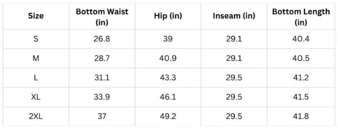 SIZE CHART - BOTTOM (Inches)