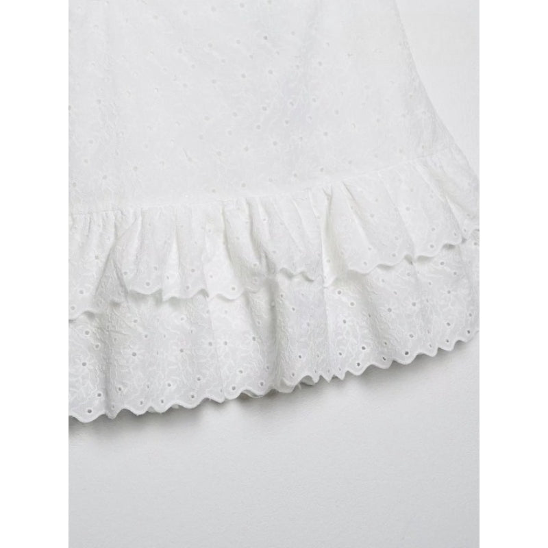 A Women's Mini Skirt With Ruffled Cutwork Embroidery. This A-line skirt features an empire waist cut and a ruffled hem. The classic mini length and high-waisted silhouette make it a great transitional piece for the season. This gorgeous skirt with ruffled cutwork embroidery for a vintage look. The skirt is crafted from a comfortable cotton material which is very comfortable and durable.